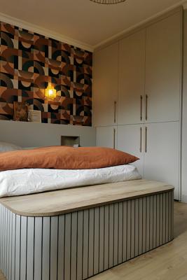 Dans cette maison des années 70, mes clients, après avoir rénové l'ensemble des sols des chambres dans des tons bois, ont voulu se réapproprier leur espace parental avec une ambiance plus douce et plus lumineuse tout en gardant du cachet.