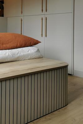 Un ensemble d'agencements vient envelopper cette chambre de tonalités beiges et laitons, réchauffant l'espace dans un joli cocon. Une commode comprenant tiroirs et abattant vient s'intégrer en douceur dans ce décor. Chaque détail est minutieusement pensé ! Au plafond les corniches soulignent avec élégance les jeux de matières et de couleurs !