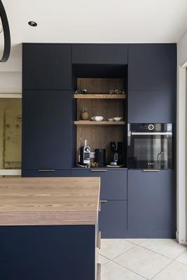 Des colonnes intégrant l'électroménager, de nombreux rangements, et un volume "espace café", offrent aujourd'hui à cette nouvelle cuisine une capacité de stockage généreuse. Le plan de travail "évier et cuisson" d'une très grande profondeur, rend les tâches quotidiennes plus confortables.