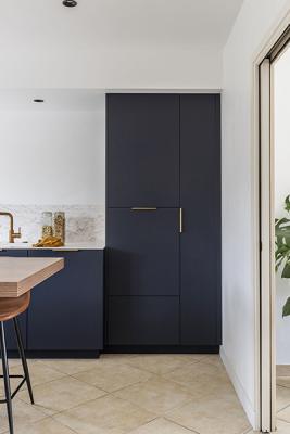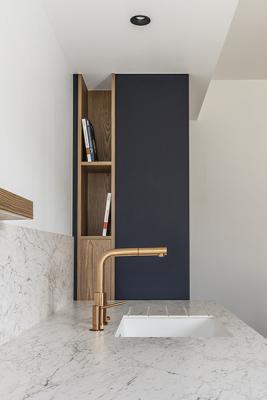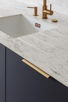 Le bleu de Prusse, noble et élégant, associé au bois foncé et au cuir donnent ce caractère très marqué à la pièce. En douceur, la beauté du marbre blanc et les aciers en or brossé viennent alléger le rendu final.