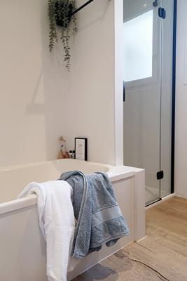 Auparavant, une salle de bain froide au carrelage bleu d'une trentaine d'années trouvait sa place ici. Mes clients ont souhaité revoir cette pièce dans sa totalité afin de lui donner une nouvelle vie avec une décoration plus chaleureuse et lumineuse.